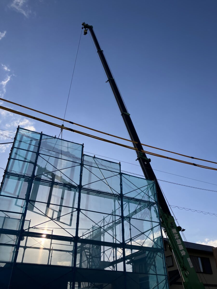 上棟日和 こんにちは営業の藏谷です。 先日、S様邸の上棟(建て方工事)をさせていただきました。 写真は朝日をバックにクレーンで次々部材が運ばれる様子です。 夕方には工事も無事終わり、サッシの取り付け、配線工事、断熱工事など3か月ほど工事が続きます。 S様上棟おめでとうございます!