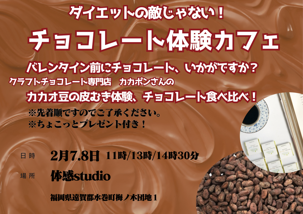 チョコレート好きのスタッフによる体験カフェ、先着順で「ちょこっとプレゼント付き」ですので、オーナー様はもちろん、家づくり検討中の方、是非ご来場ください。